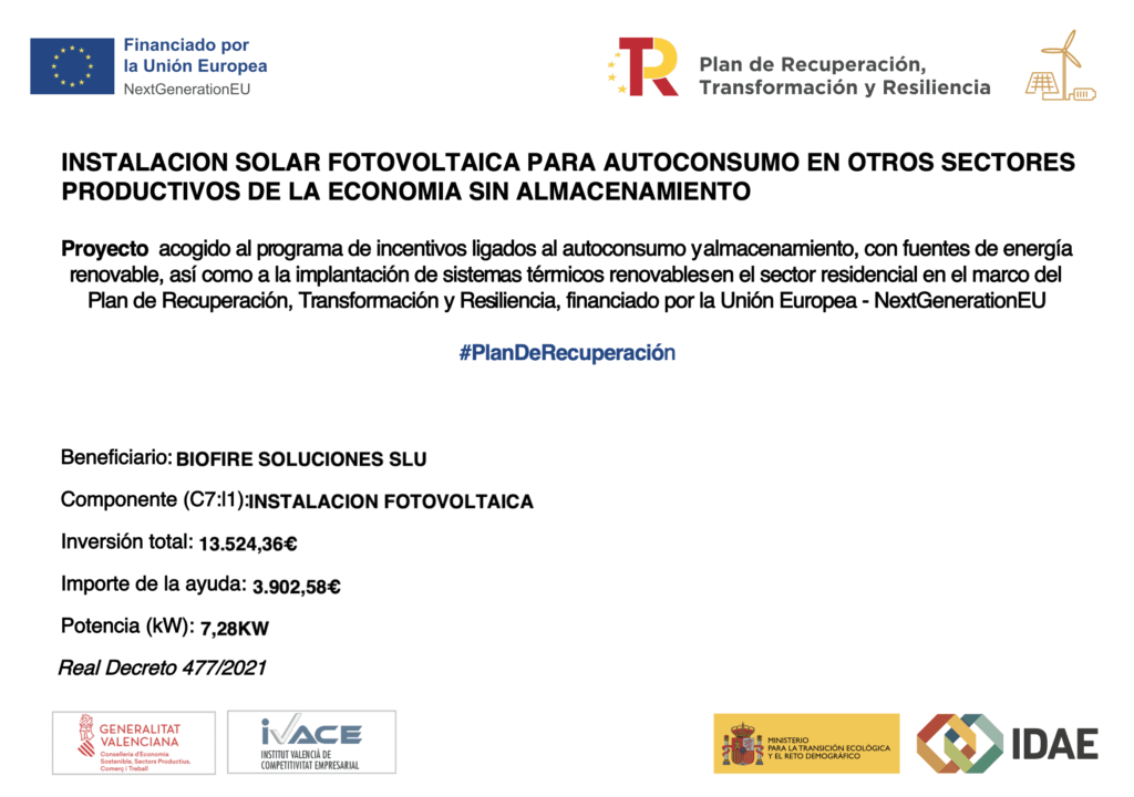 Instalación Solar Fotovoltaica para Autoconsumo – Proyecto Subvencionado En el marco de nuestro compromiso con la sostenibilidad y la eficiencia energética, hemos llevado a cabo la instalación de un sistema solar fotovoltaico para autoconsumo, sin almacenamiento, en nuestras instalaciones productivas. Esta actuación tiene como objetivo principal reducir el consumo energético proveniente de fuentes no renovables, disminuir nuestra huella de carbono y avanzar hacia un modelo energético más sostenible y competitivo. El proyecto ha sido subvencionado con el apoyo financiero de los Fondos Next Generation EU, en el contexto del Plan de Recuperación, Transformación y Resiliencia del Gobierno de España. Esta ayuda ha sido esencial para impulsar la transición energética de nuestra actividad y fomentar el uso de energías limpias dentro del sector productivo. Gracias a esta instalación, se ha logrado: Incrementar la eficiencia energética de nuestra actividad. Reducir significativamente las emisiones de CO₂. Optimizar los costes energéticos mediante el autoconsumo directo de energía solar. Esta actuación refuerza nuestro compromiso con la innovación y la sostenibilidad, alineándonos con los objetivos estratégicos de recuperación económica verde establecidos por la Unión Europea.